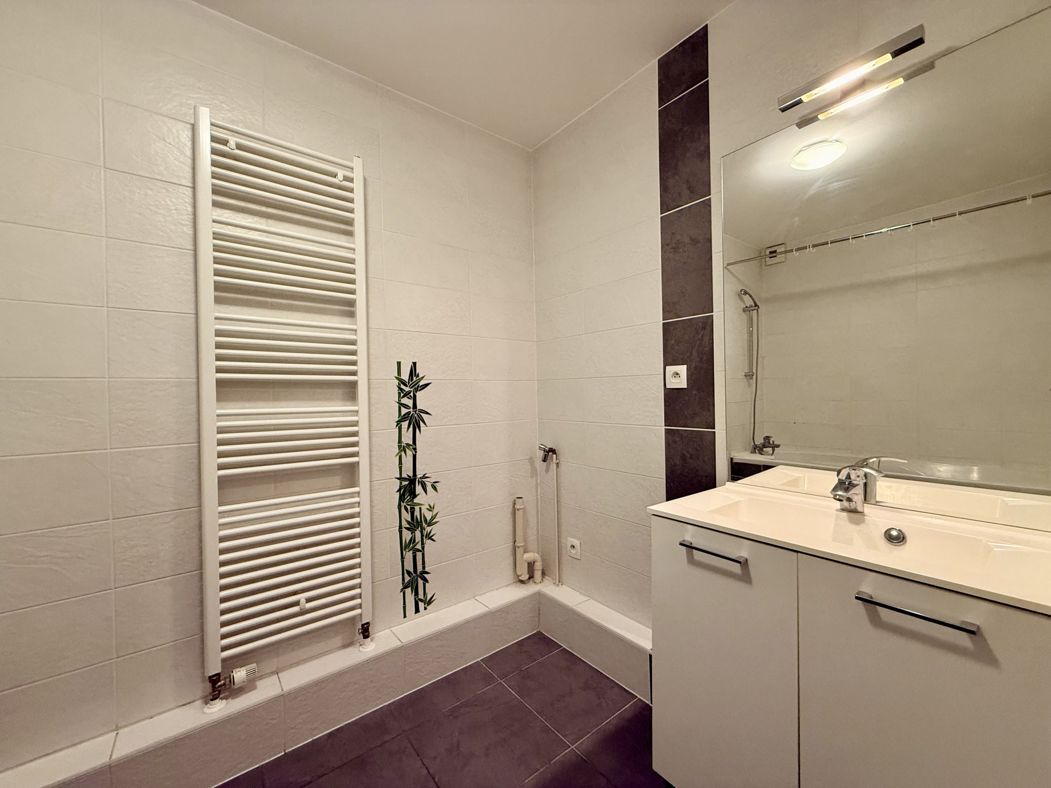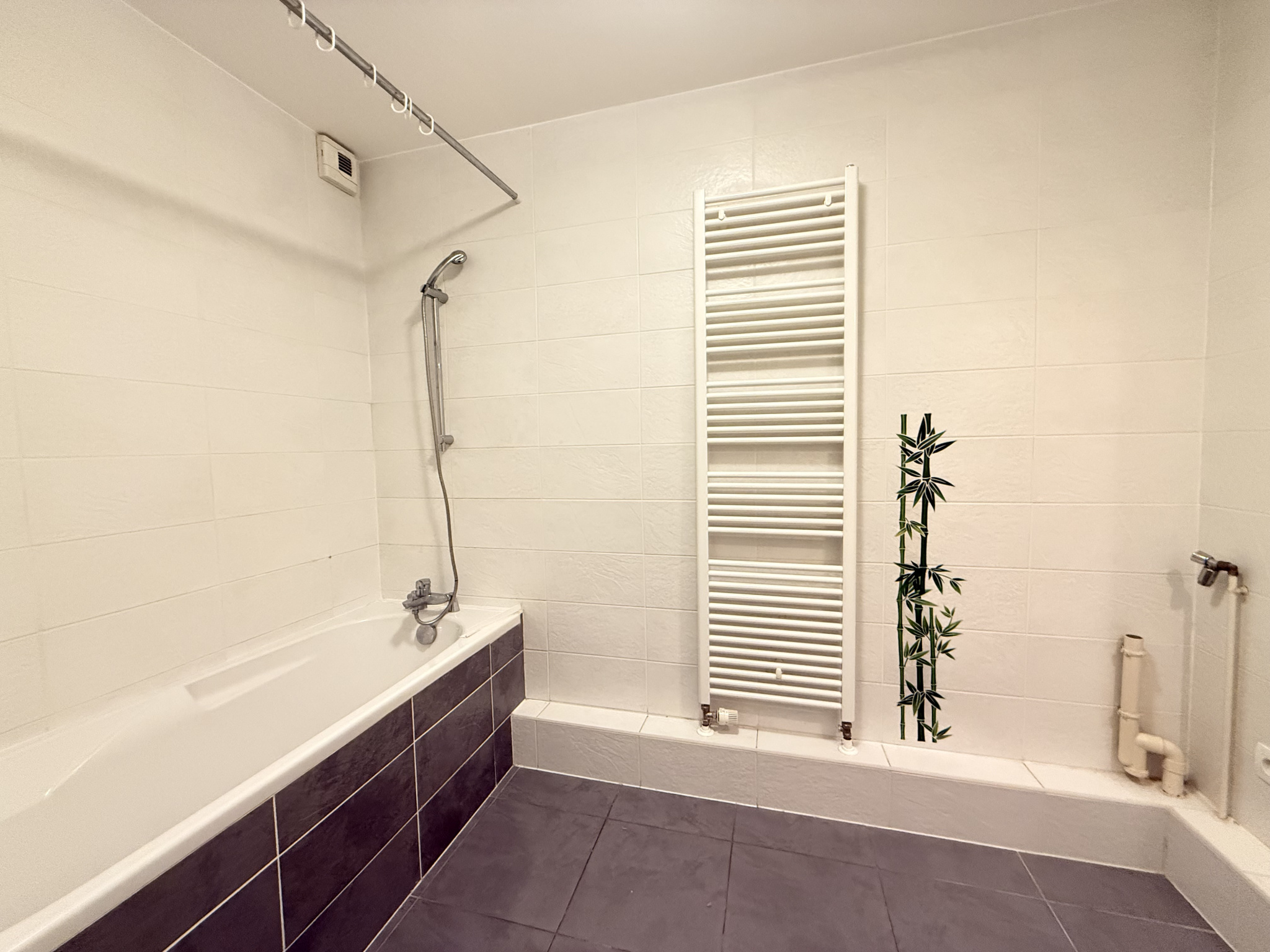 – Une salle de bains avec baignoire, meuble vasque, radiateur sèche serviettes.