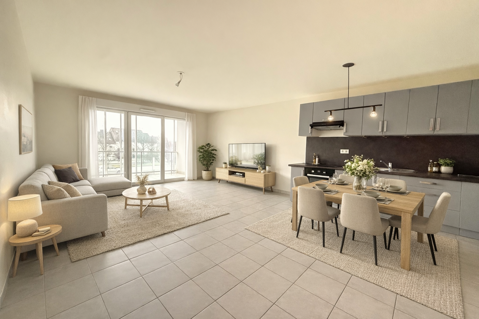 Ce superbe et fonctionnel appartement 2 pièces de 56 m2 avec terrasse et parking se compose comme suit :