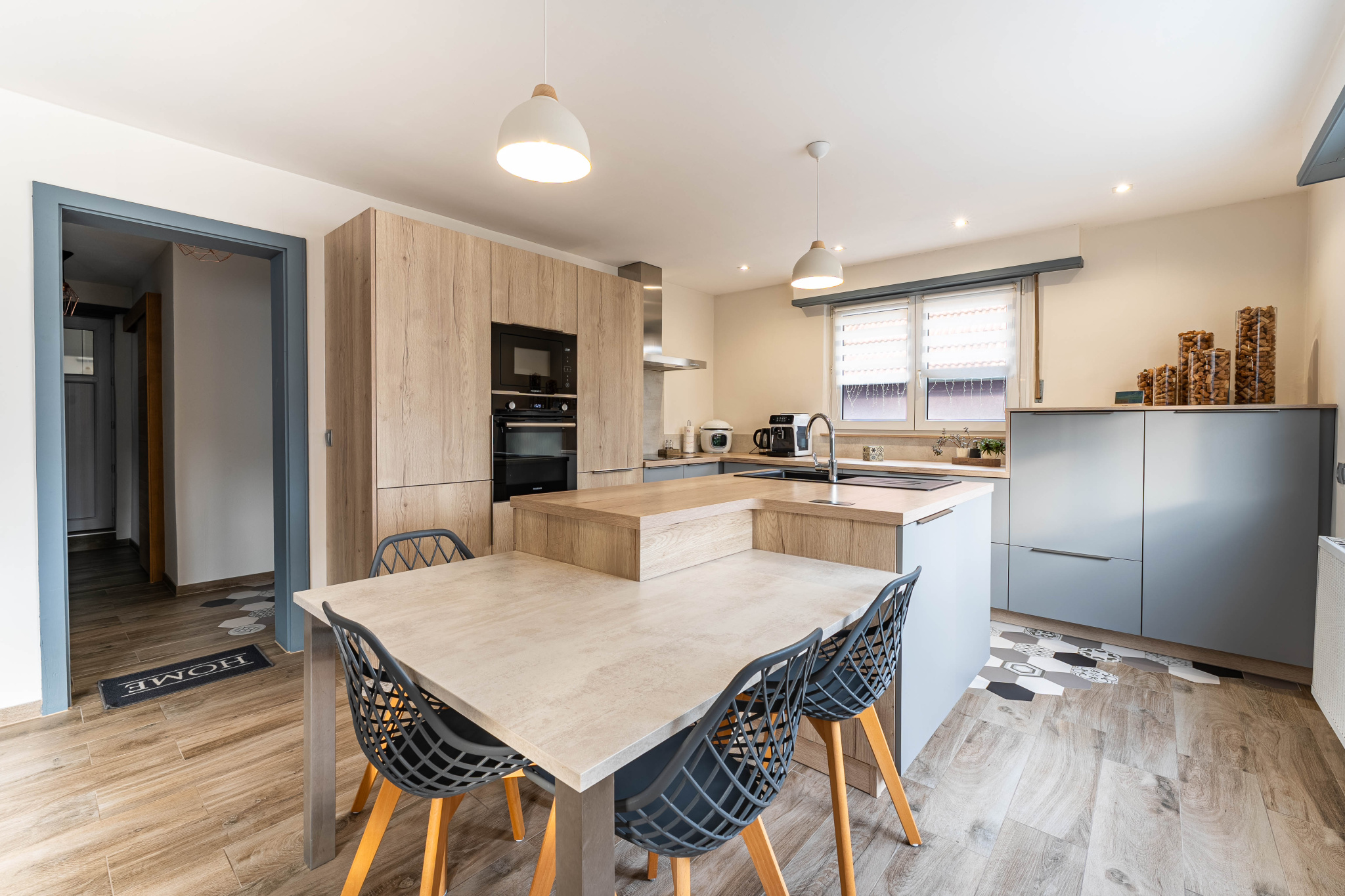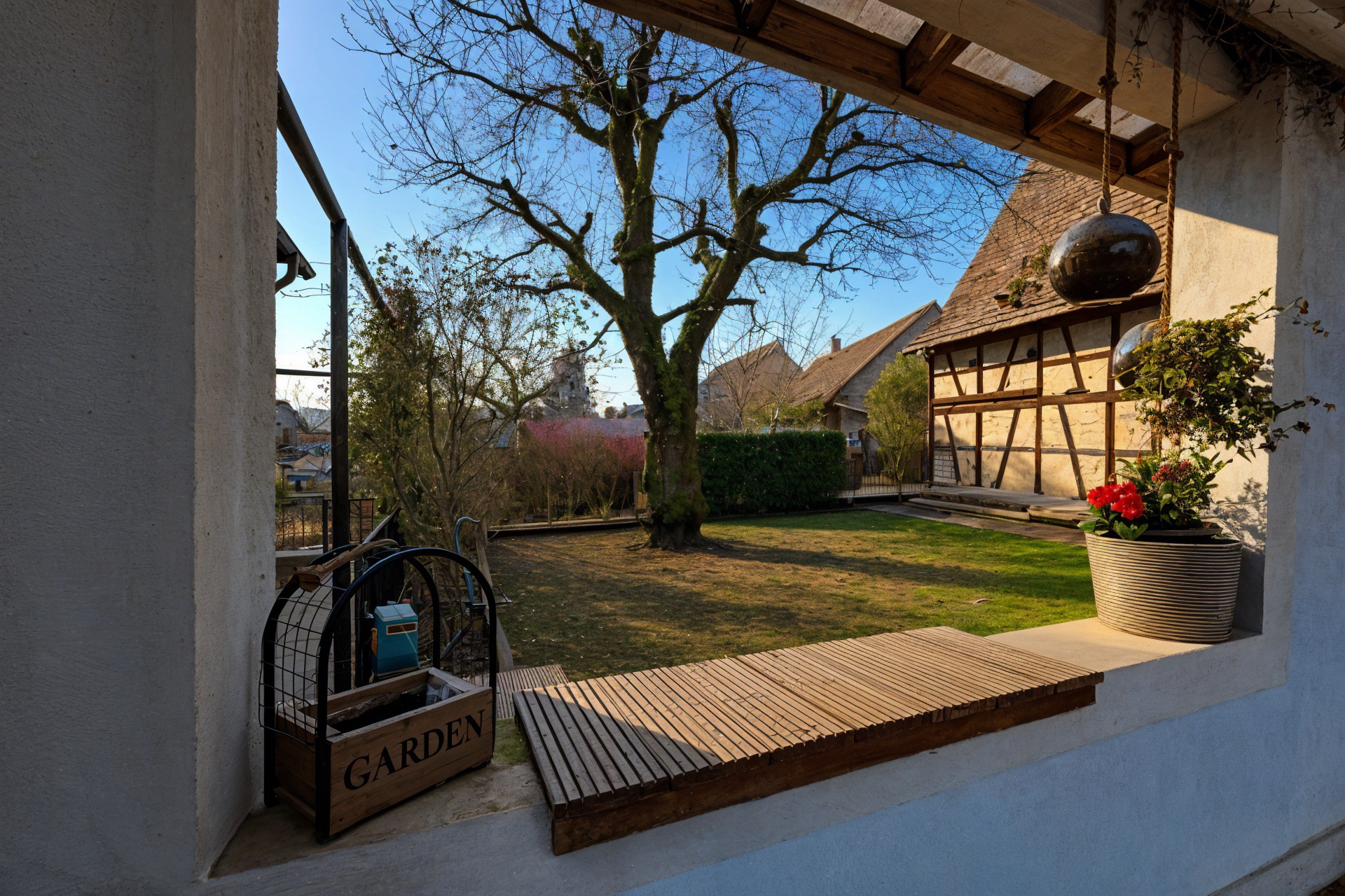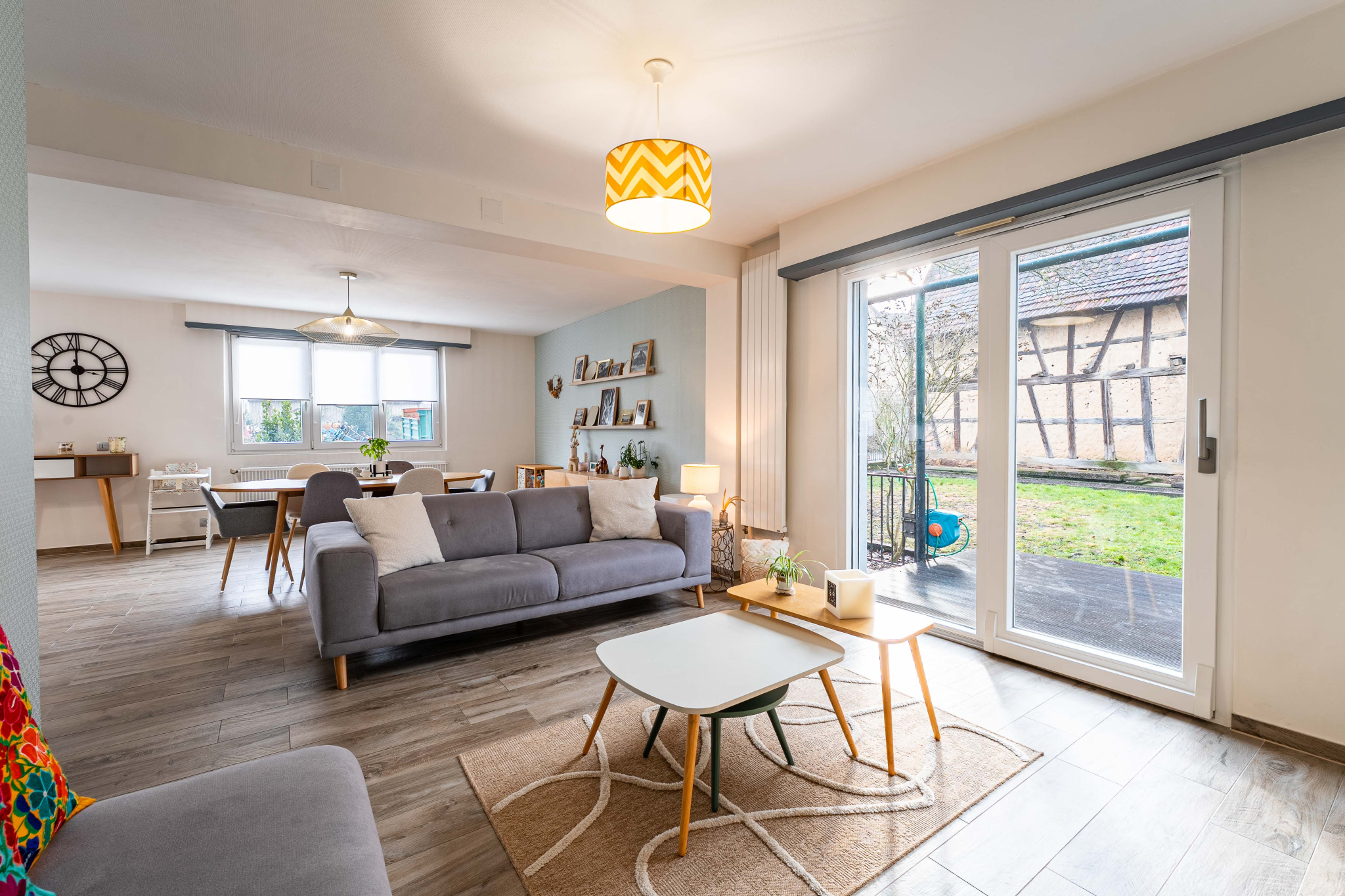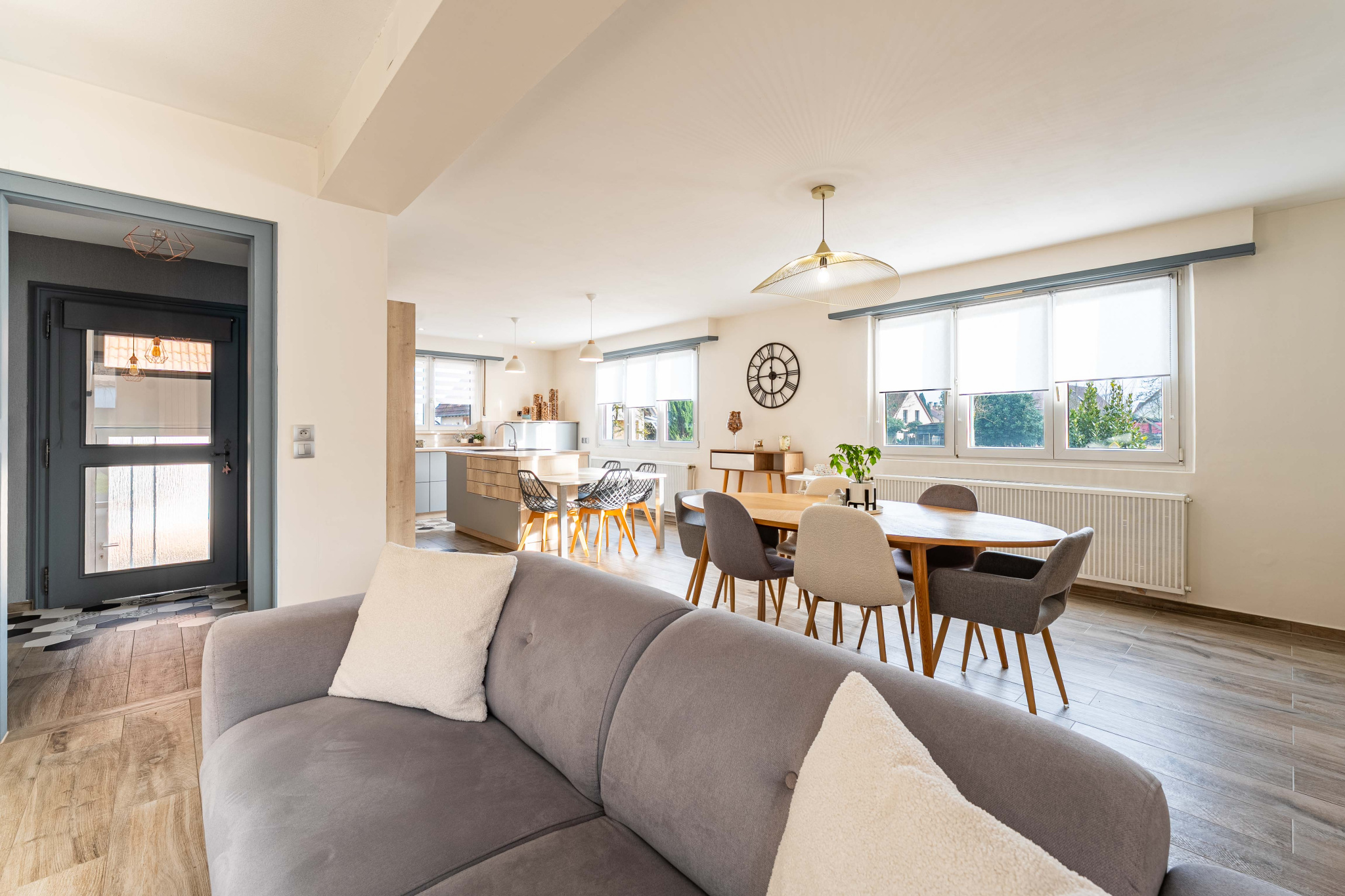 Au calme à Weyersheim, à 2 pas de la gare, belle maison rénovée avec goût de 5/6 pièces, offrant 134 m2 complétés par deux pièces aménagées au sous-sol surélevé.