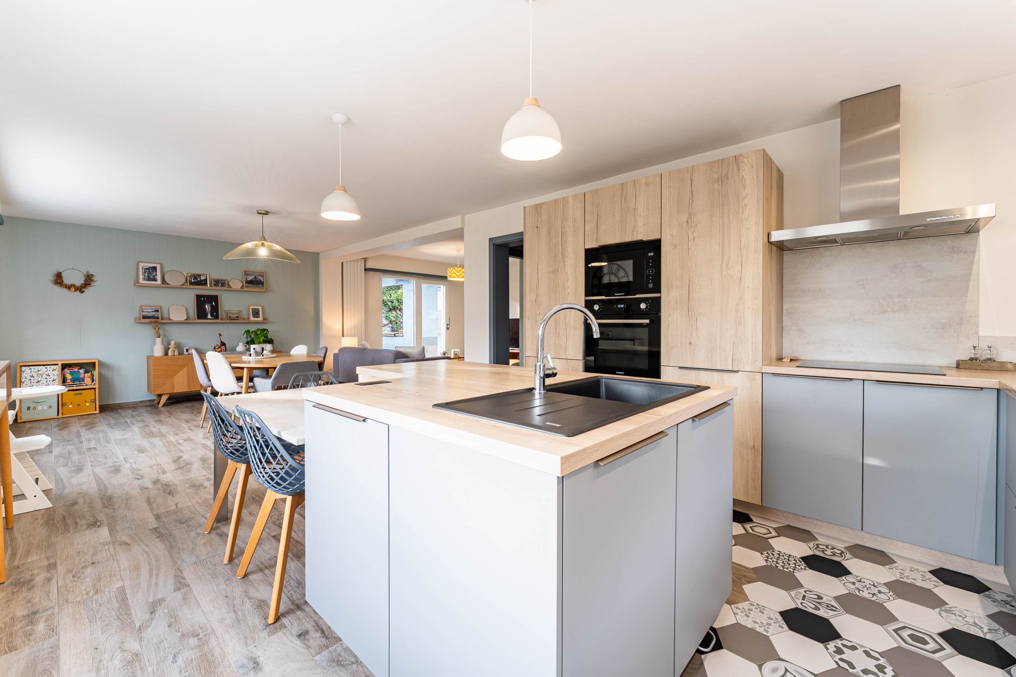 Spacieuse et lumineuse pièce de vie, salon / séjour / cuisine équipée haut de gamme ouverte, bénéficiant d’une triple exposition, d’une surface de plus de 50 m2, avec accès direct à la terrasse et au jardin arboré et piscinable