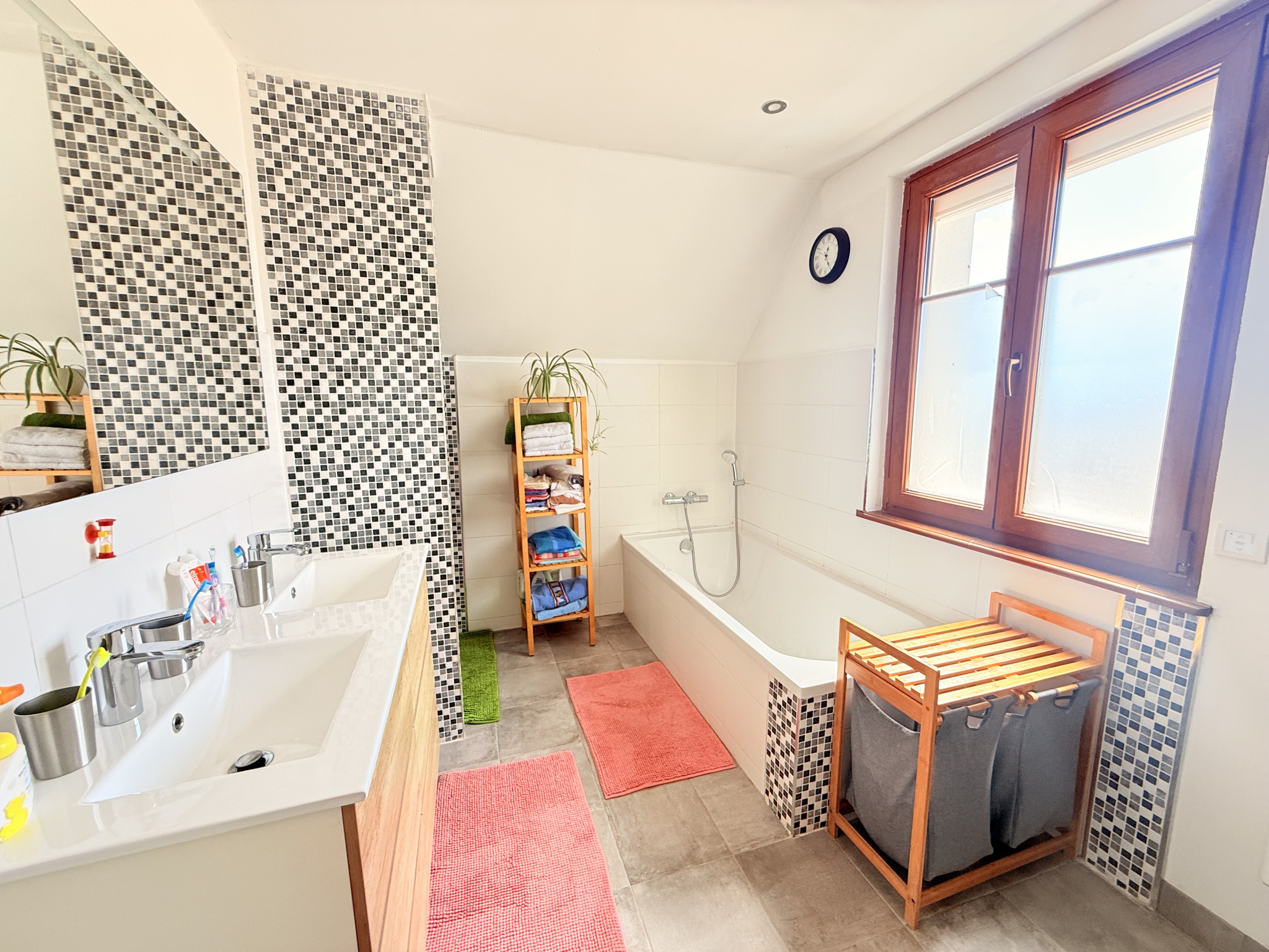 Salle de bain élégante avec baignoire, douche à l’italienne et double vasque.