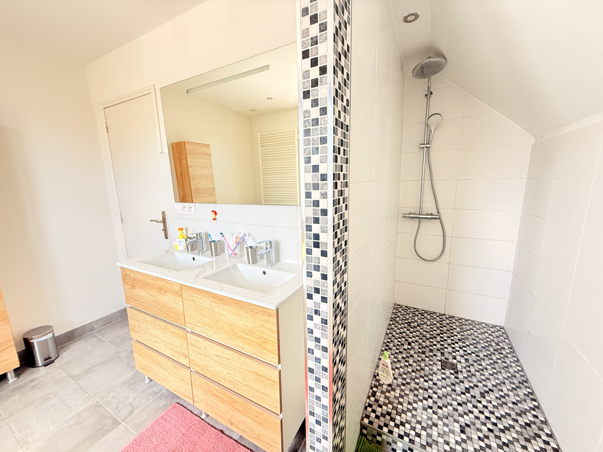 Salle d’eau moderne avec douche à l’italienne et WC avec lave-mains.