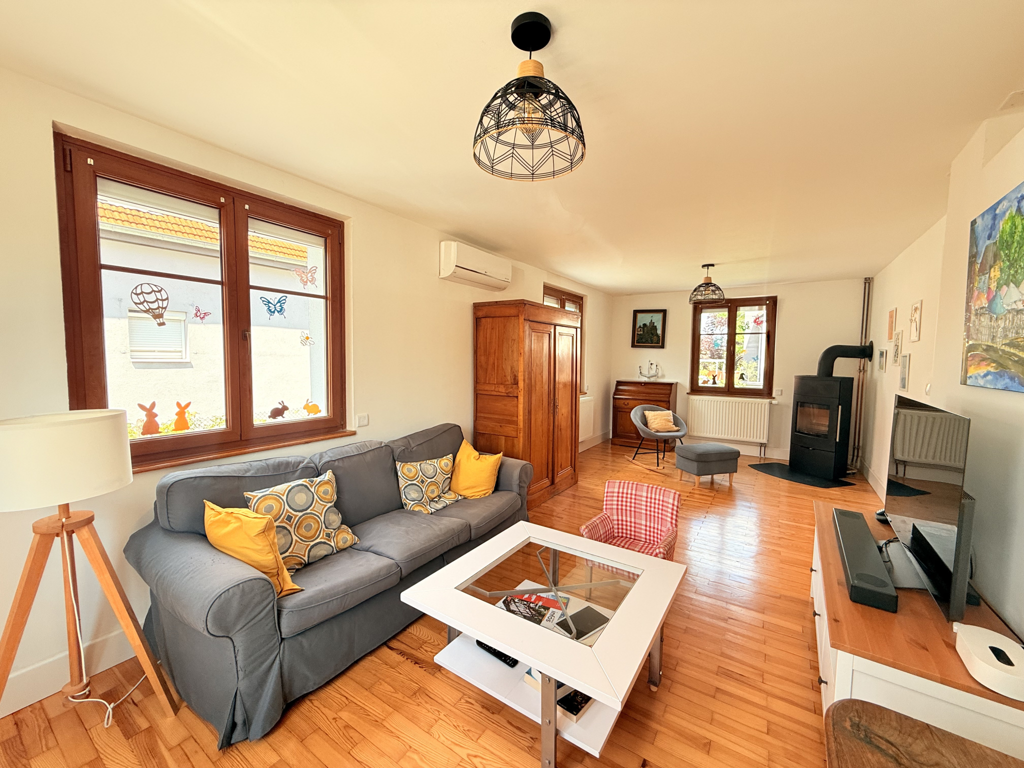 Chauffage : chaudière fioul, poêle à bois et climatisation réversible dans le séjour.