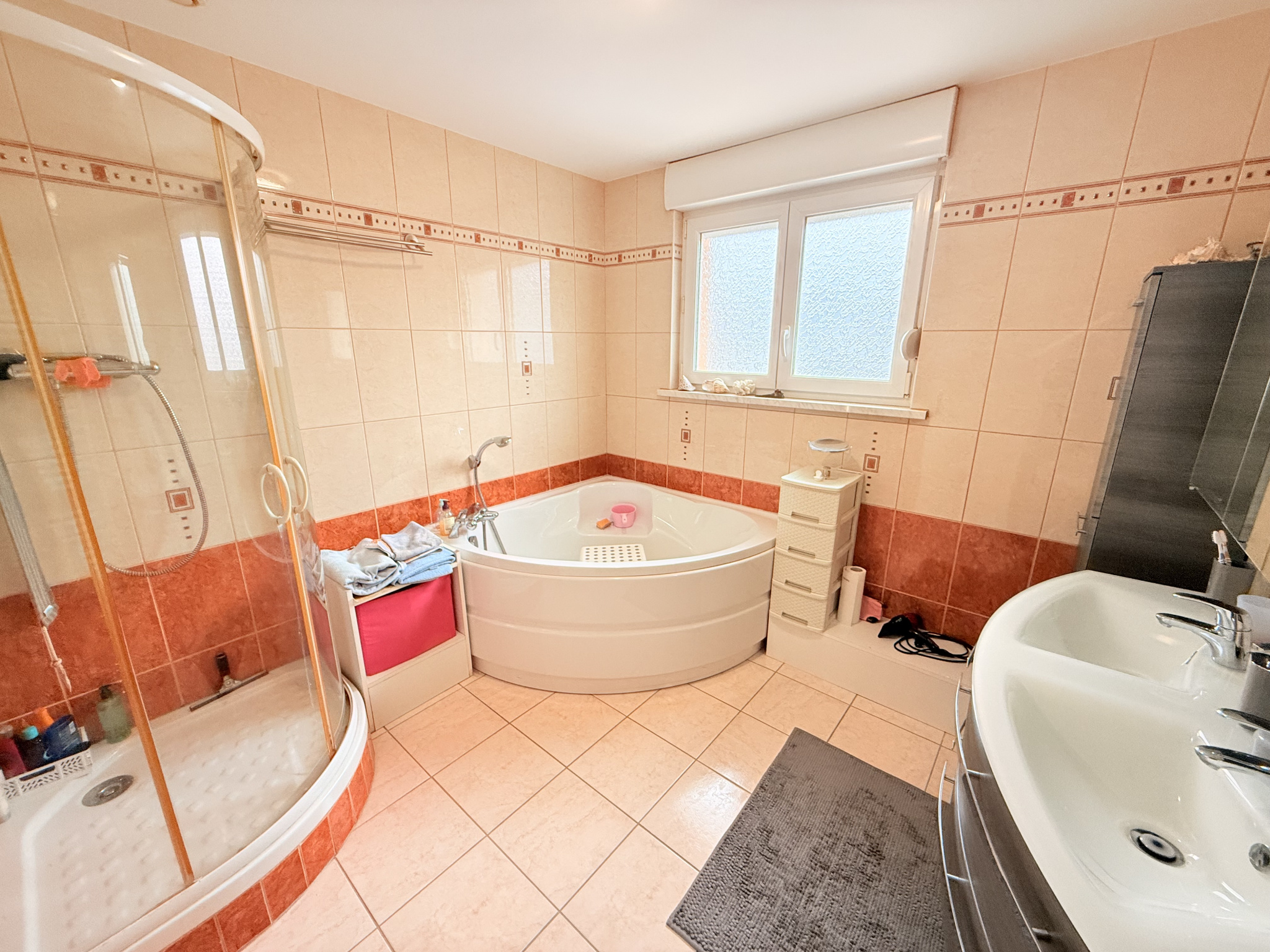– 1 spacieuse salle de bains avec douche , baignoire , double vasque , fenêtre.